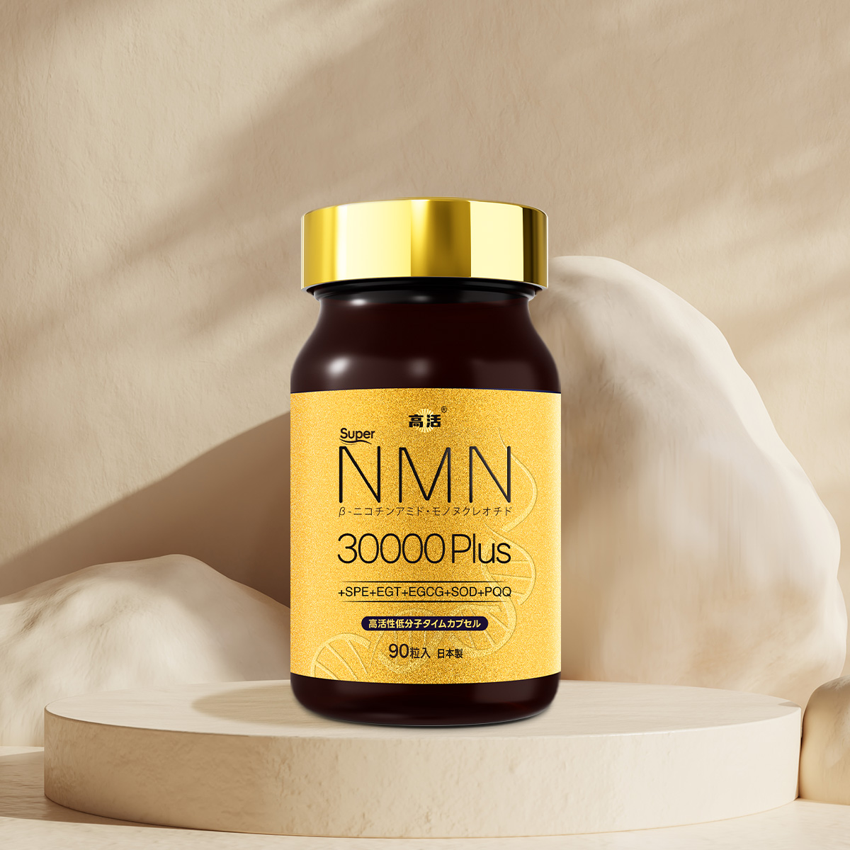 β-ニコチンアミド・モノヌクレオチド(日本製造)、きのこエキス末、米胚芽抽出物、ピロロキノリンキノン二ナトリウム塩、ホスファチジルセリン含有リン脂質末、メロン抽出物/セルロース、HPMC、V.C、ステアリン酸Ca、微粒酸化ケイ素、チャ抽出物、V.B₆、カラメル色素、V.B₂、V.B₁₂、(一部に小麦・大豆を含む)